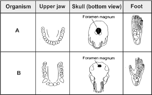 Study the diagrams below of the upper jaw, skull and foot of two organisms A and B. The diagrams are NOT drawn to scale.
